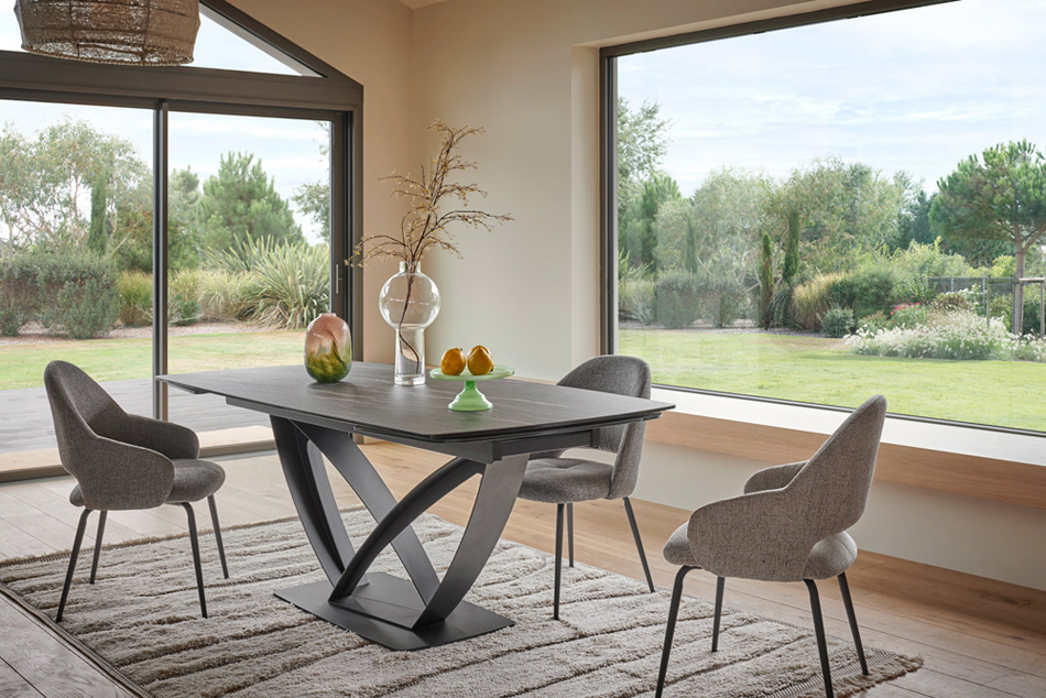 Réf. TIC30200 Dimensions : l 200/290 x h 77 x p 95 cm 1 allonge galbée de 45 cm à chaque bout sur coulisses table avec allonge