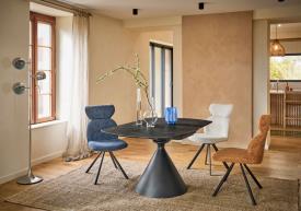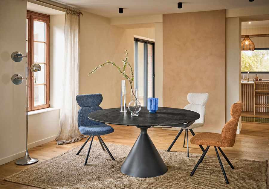 Réf. TIC70150 Dimensions : l 95/150 x h 77 x p 150 cm Système d’allonge revolving de 27,5 cm à chaque bout table ronde avec allonge