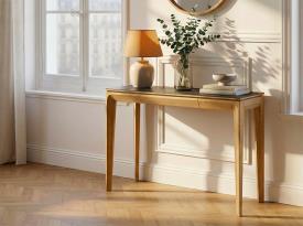 Dasras Design. Didier Versavel Dimensions : l 90/100/110 x h 75 x p 43 cm Plateau bois ou céramique La console Buzz de Dasras est une création signée du designer Didier Versavel. Disponible en deux essences de bois, avec un plateau en bois ou en céramique, cette console se décline en trois longueurs différentes. Compacte, elle est équipée d’un tiroir ce qui en fait le choix idéal pour organiser un espace. Disponible en chêne et noyer us. Piètement, ceinture et façade de tiroir en bois massif. Côtés et supports des tiroirs en bois divers massif, fond des tiroirs en multiplis. Plateau en bois massif ou dessus céramique 6 mm collé sur mdf de 19 mm avec alèses massives.