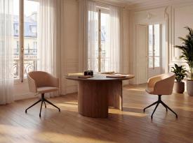 Dasras Design. Guillaume Delvigne Dimensions : l 56 x h 80 x p 55 cm 4 branches sans roulettes L’association du style design et de l’influence vintage pour la chaise de bureau Oscar. Le dossier enveloppant, les lignes douces et épurées de la chaise Eora déclinée en version chaise de bureau avec et sans roulettes. Piétement 4 branches en aluminium. Système de rotation 360° Coque en bois mdf entièrement tapissée comprenant une partie arrière recouverte de 10mm de mousse et une partie intérieur avec une mousse de 30 mm, une assise sur sangles recouverte de mousse de 30 mm. L’ensemble est tapissé d’un revêtement tissu ou cuir de votre choix.