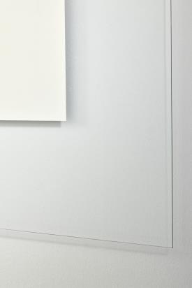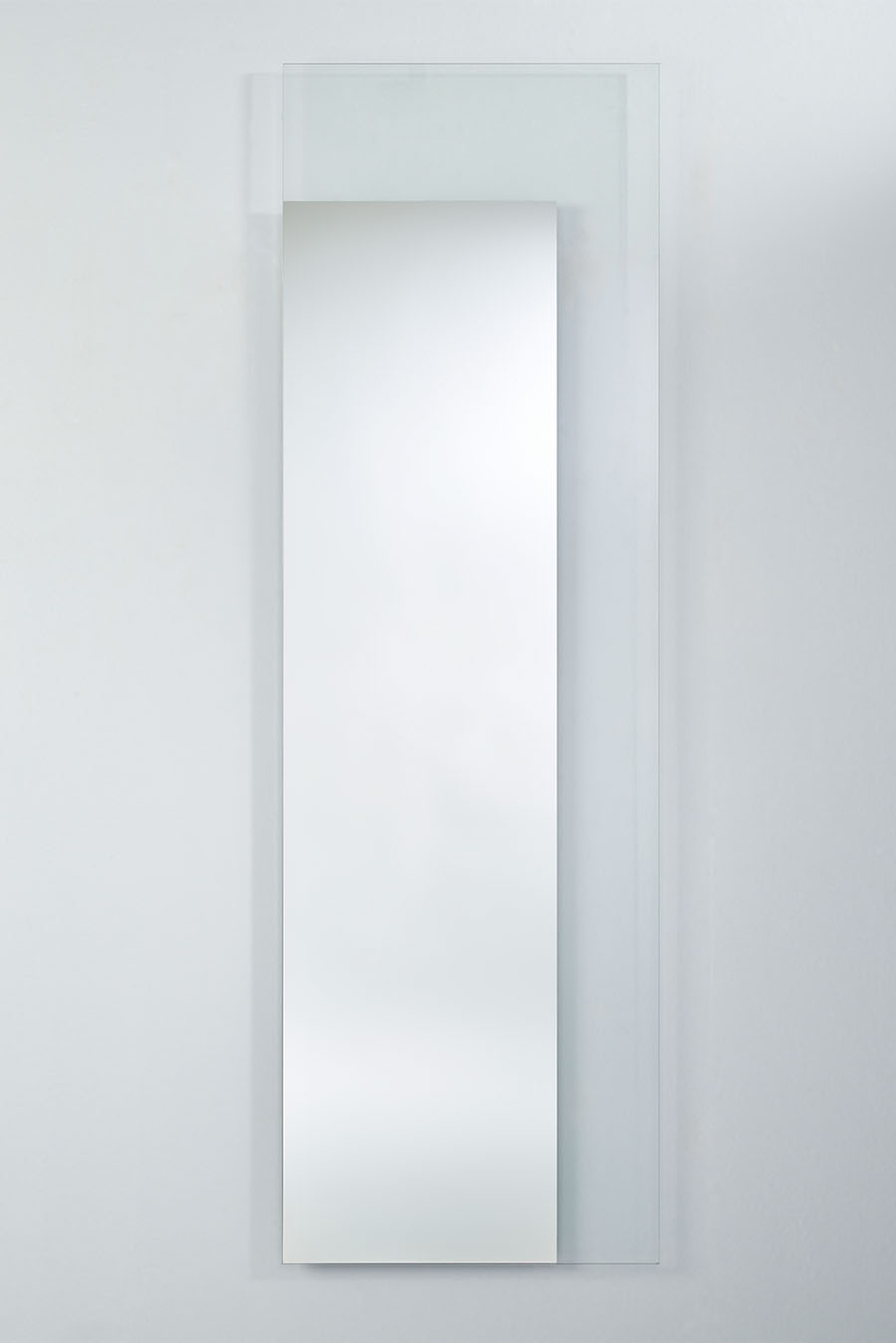 La partie argentée s’interrompt brusquement sur deux côtés. Le verre transparent se fond sans rupture dans le mur sur les deux autres. Le miroir se dissout ainsi subtilement dans l’arrière-plan. Miroir et mur ne font plus qu’un. Lorsque la lumière naturelle traverse, elle filtre à travers les zones transparentes ou se reflète sur les parties argentées, projetant derrière la surface des ombres architecturales et délicates. Le résultat est une image flottante — une composition discrète de lumière, de lignes et de reflets.