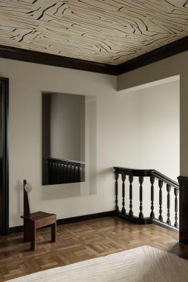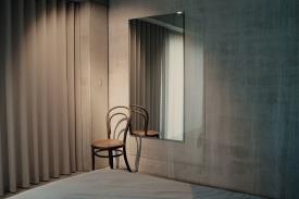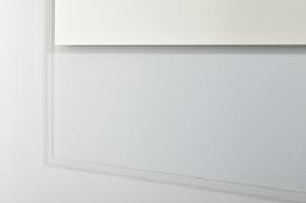 La partie argentée s’interrompt brusquement sur deux côtés. Le verre transparent se fond sans rupture dans le mur sur les deux autres. Le miroir se dissout ainsi subtilement dans l’arrière-plan. Miroir et mur ne font plus qu’un. Lorsque la lumière naturelle traverse, elle filtre à travers les zones transparentes ou se reflète sur les parties argentées, projetant derrière la surface des ombres architecturales et délicates. Le résultat est une image flottante — une composition discrète de lumière, de lignes et de reflets.