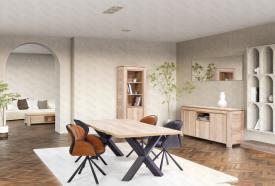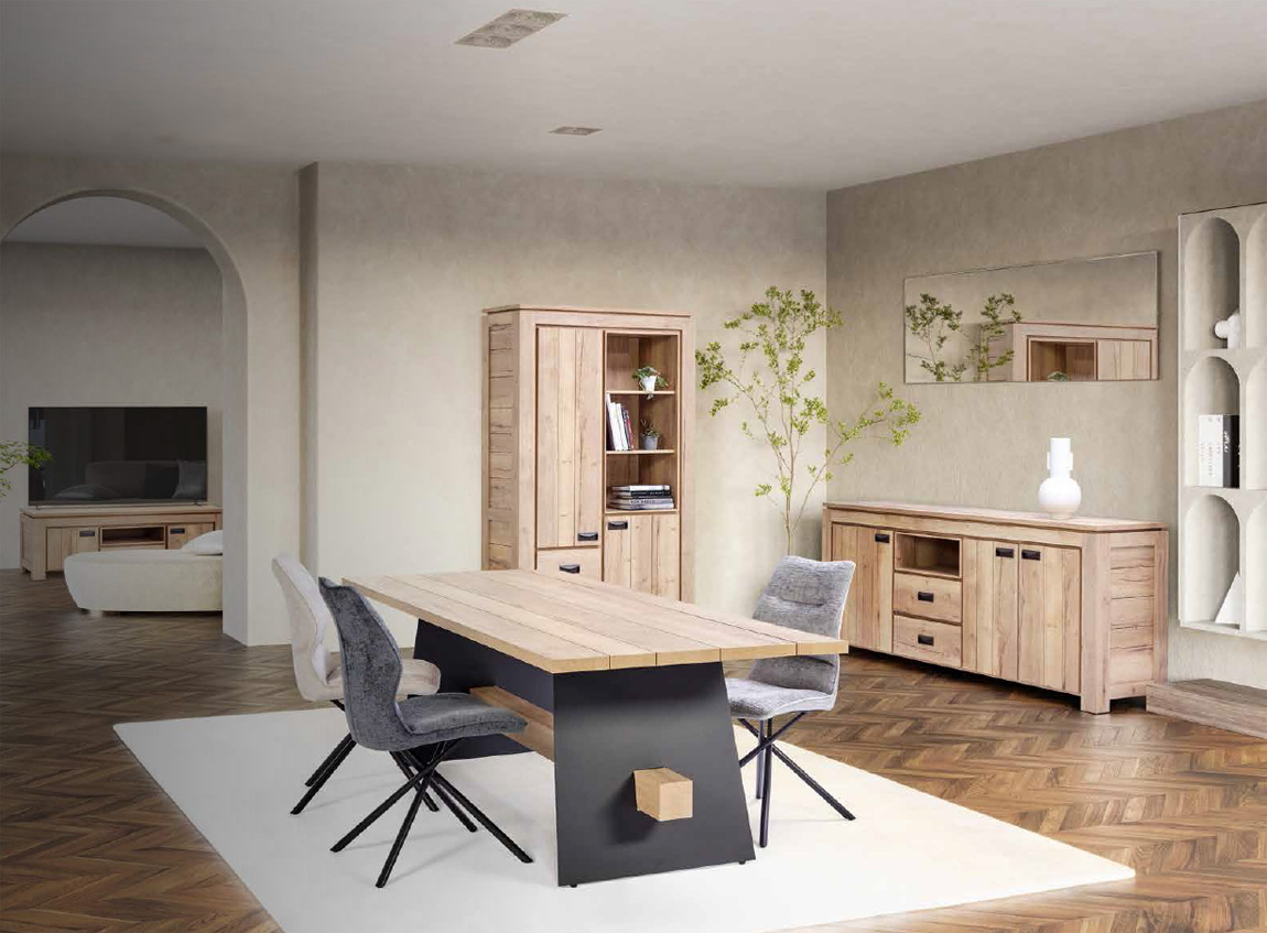 Lievens Chêne Halifax nature Finition poignées: invisible (fraisées dans les portes) ou visible (monté sur les portes) Pieds métal – finition poudre noir mat Chants ABS 1 mm Fermeture avec amortisseur soft-close Préassemblé mais démontable enfilade : l 202/230 x h 93 x p 50 cm vitrine (2 portes - 2 tiroirs - 3 niches) : l 120 x h 197 x p 50 cm colonne (1 porte - 3 niches) : l 76 x h 197 x p 50 cm meuble tv (2 portes - 1 tiroir - 1 niche) : l 170/202 x h 56 x p 50 cm table basse avec tiroir : l 125 x h 42 x p 62 cm