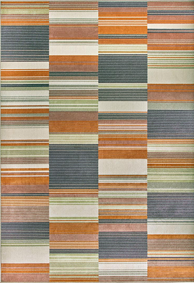 Le tapis VITTORIA 9780006/6111 présente un design dynamique et coloré, caractérisé par une composition de rayures horizontales et verticales alternant des teintes chaudes comme le marron et l'orange avec des nuances de vert et de beige. Ce motif moderne en grille confère à ce tapis une esthétique polyvalente, parfaite pour les espaces contemporains. Sa fabrication mécanique garantit des détails précis et une finition de haute qualité, tandis que l'association des matériaux en fait un élément d'ameublement durable et fonctionnel.