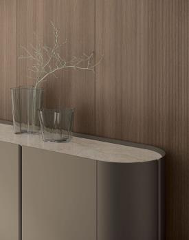 Tomasella Dimensions : l 206 x h 85 x p 51 cm Plateau en fonte laquée 091 avec un plateau en grès cérame poli de style Taj Mahal. Socle en fonte laquée métallisée. Le lambris mural en imitation gant, avec sa finition traccia, sert de toile de fond au buffet Calipso. Ses lignes douces et arrondies sont mises en valeur par sa finition laquée métallisée en fonte, associée à un plateau en grès cérame poli de style Taj Mahal. buffet